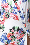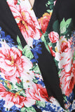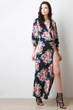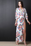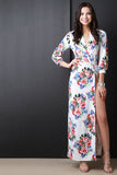 This sexy maxi dress features floral bouquet print, surplice front, long bishop sleeves, and high side slit. Accessories sold separately. Made in U.S.A. 95% Polyester, 5% Spandex.