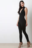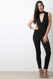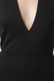 This sleeveless jumpsuit features a knit fabrication, mock neckline deep-v cutout, open back, and taper cut legs finished with a button at nape. Accessories sold separately. Made in U.S.A. 95% Rayon, 5% Spandex.