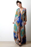 Abstract Leaves Plunging V Thigh High Slit Maxi Dress