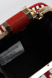 This mini clutch features a tribal woven fabric on a hard square body, glossy metallic trim, and an octagonal cylinder latch with a vegan leather panel. The interior is lined and has elasticized gussets at the side. Bag includes detachable shoulder cable chain with a 23.5" drop.