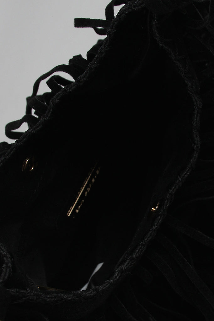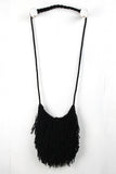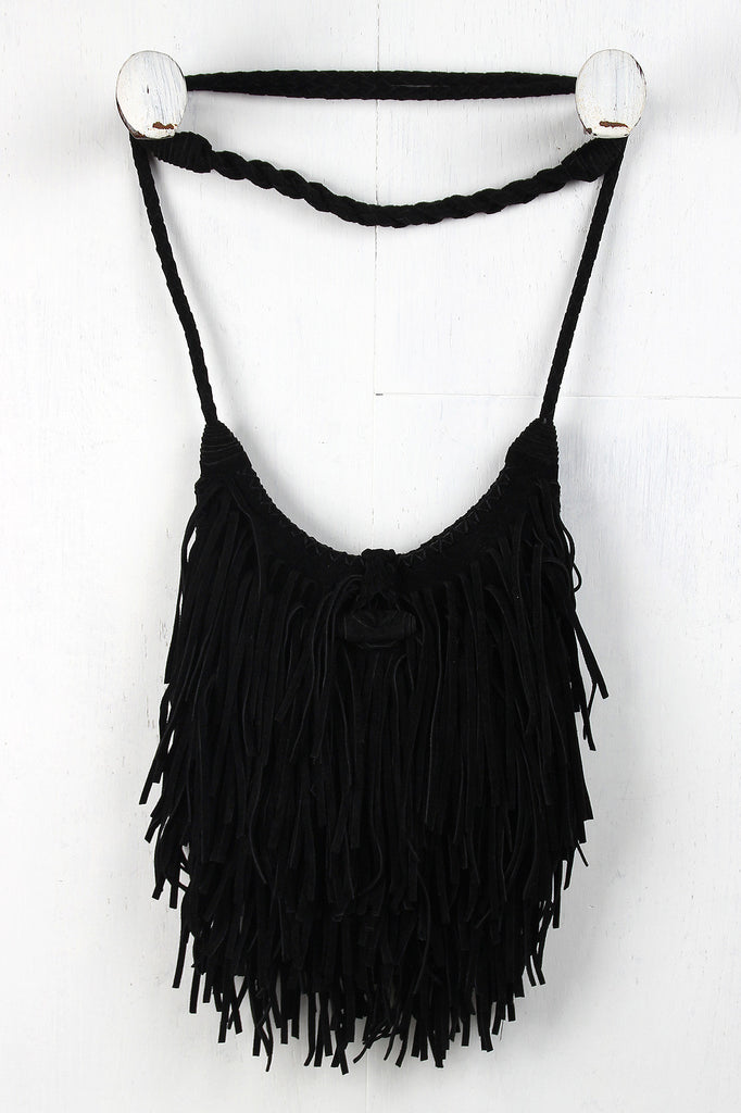 This street-chic crossbody bag features a vegan suede with allover fringe detail, zigzag stitching accents along the edges, braided shoulder strap, rolled toggle exterior, and magnetic snap interior closure. Finished with one interior zipper pocket and fabric lining. Crossbody strap has a 22" drop.