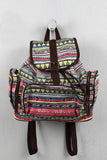 This backpack features tribal pattern canvas main with vegan leather straps and trim. Exterior features three zip closure pockets, magnetic button closure, and drawstring. Interior features magnetic snap button, one zipper pocket, two open pockets, and lining. Bag is finished with adjustable backpack straps and top handle (3" drop).