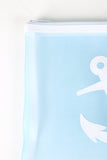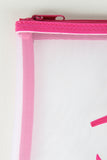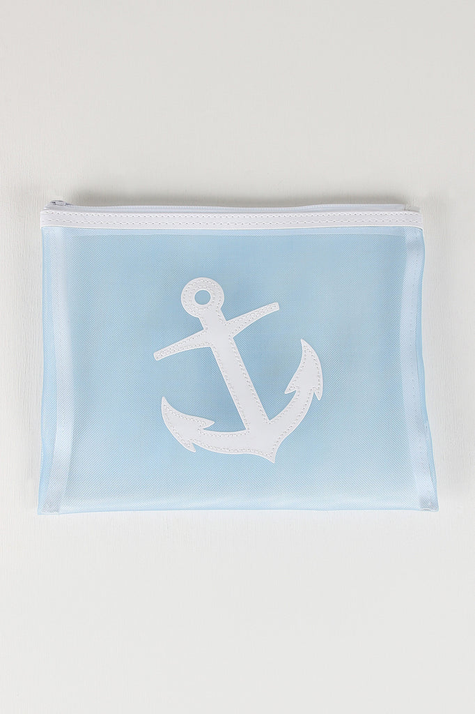 This trendy handheld pouch features sheer mesh, patent trim, anchor design, and top zipper closure.