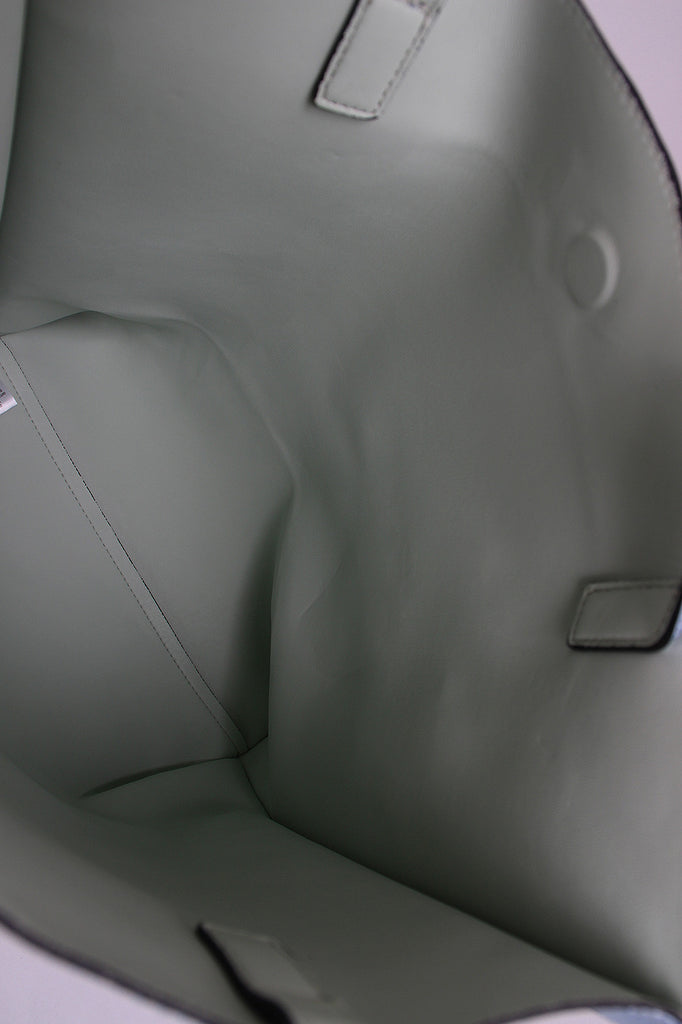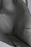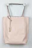 This simple and classic tote bag features smooth vegan leather, removable looped strap decor, snap button closure, and finished with top handles (11" drop).