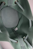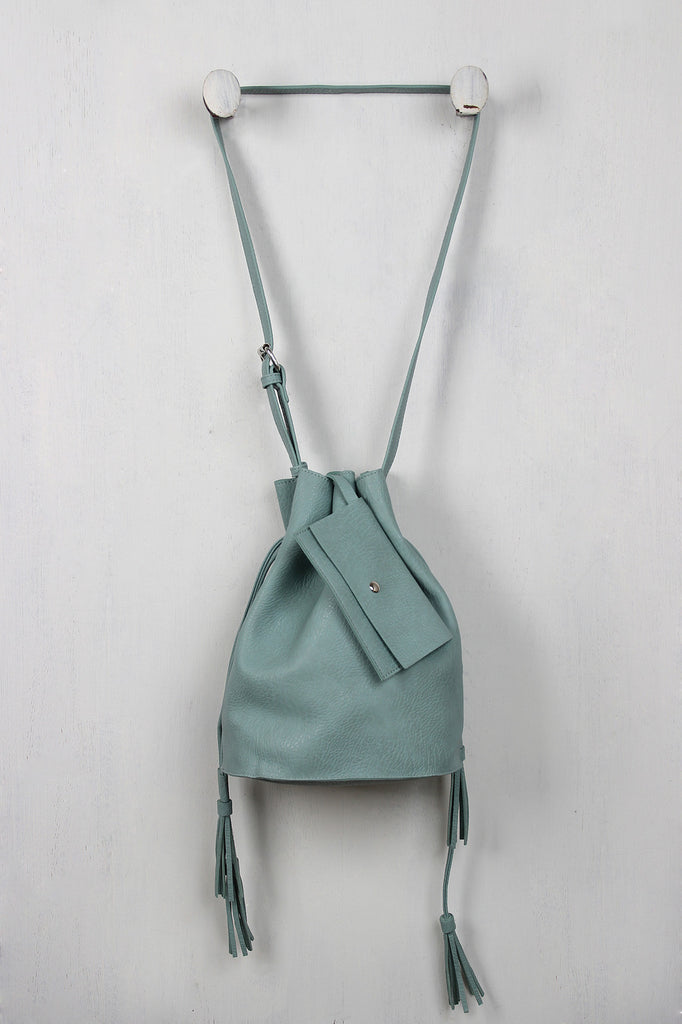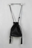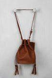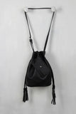 This trendy bucket bag features textured vegan leather, and double drawstring closure with tassel embellishments. Bag is finished with matching removable envelope wallet and adjustable buckle shoulder strap (18.5" drop).