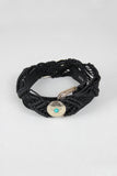 This trendy western style belt features strappy knotted cords, contrast vegan leather, embossed gold-tone conchos with turquoise stone accents, and adjustable closure.