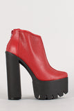 Featuring perforated leatherette upper, almond toe, chunky platform, rear zipper closure, chunky heel, lug sole, and finished with lightly padded insole.