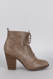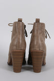 This combat style inspired bootie has a lace up tie closure and a side zipper for easy on-off wear. Features a stacked chunky heel. Finished with stitching detail.