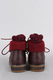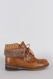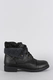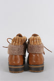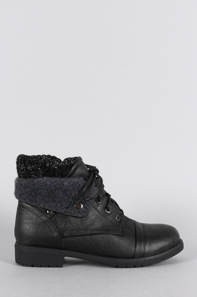 These booties feature a soft sweater cuff, fold over faux fur collar design with snap button detail, rounded toe, and low heel. Finished with cushioned insole and lace up closure.