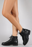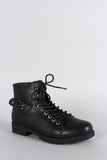 These ankle boots feature a round toe silhouette, lace up front design, studded strap detail, stitching accents, and low heel. Finished with cushioned insole, soft faux fur interior lining, and side zipper closure for easy on/off.