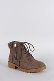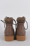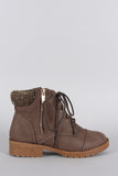 These ankle boots feature a warm sweater cuff design, round toe silhouette, side zipper trims, and low block heel. Finished with cushioned insole, fabric interior lining, and lace up front closure.