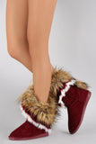 These cozy boots feature a tri-tone asymmetrical faux fur collar design, round toe silhouette, and low flat heel. Finished with cushioned insole, soft faux fur interior lining, and easy pull on style.