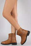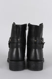 These sturdy ankle boots feature a strappy design on shaft with studs/metallic hardware accents, rounded toe, top stitching details, and block heel. Finished with cushioned insole, soft interior lining, and side zipper closure for easy on/off.
