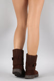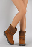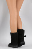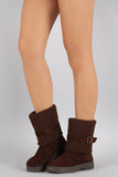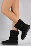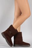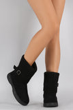These warm flat boots feature a faux suede upper with fold over sweater design, wrapped around strap with buckle accents, and rounded toe. Finished with cushioned insole, soft faux fur interior lining, and easy pull on construction.