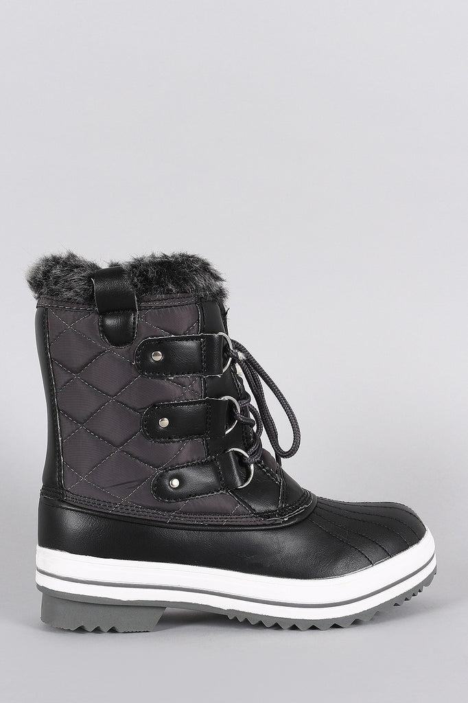 These boots feature a quilted nylon shaft, rounded toe, stitching accents, and low heel. Finished with cushioned insole, soft faux fur interior lining, and lace up front closure.