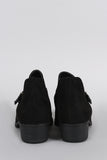 These edgy ankle boots feature a smooth vegan suede upper with perforated detail, narrow toe, side cutout design with buckled strap accents, low stacked heel, and lightly padded insole for comfort.