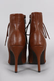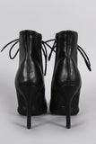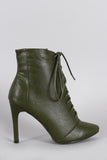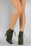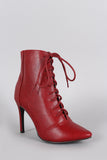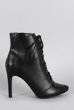 These stylish pointy toe silhouette, lace up construction, stitching accents, and wrapped heel. Finished with cushioned insole, smooth lining, and side zipper closure for easy on/off.
