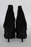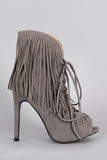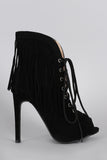 These corseting laces . Peep toe silhouette on a stiletto heel. Features fringe falling all around.