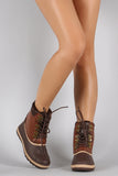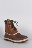 These duck booties feature a round toe with decorative ridges across the front, stitching accents, pull on tab, and lace up closure. Finished with cushioned insole and faux shearling interior lining for all day comfort.