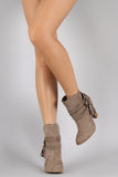 These almond toe booties feature a soft vegan suede upper, wrapped around straps with buckle accent, tassel detail at ankle, and chunky stacked heel. Finished with cushioned insole and easy pull-on construction.