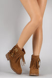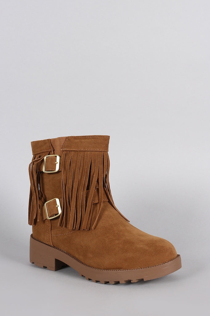 These fashionable fringe detail at ankle, decorative side buckles accent, and low block heel. Finished with cushioned insole, smooth interior lining, and side zipper closure for easy on/off.