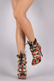 These stylish peep toe booties feature a tropical print fabric with padded vegan leather cuff, lace up construction, decorative metallic shield straps, and wrapped stiletto heel. Finished with cushioned insole and side zipper closure for easy on/off.