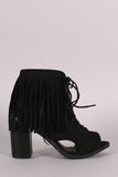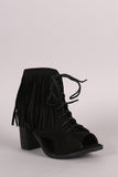 These chic fringe detail at ankle, side cutout design, and chunky stacked heel. Finished with lightly cushioned insole and side zipper closure for easy on/off.
