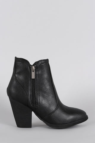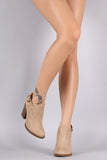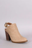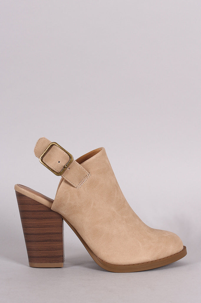 These booties feature an adjustable sling back strap and lightly padded lining. Finished on a stacked heel.