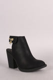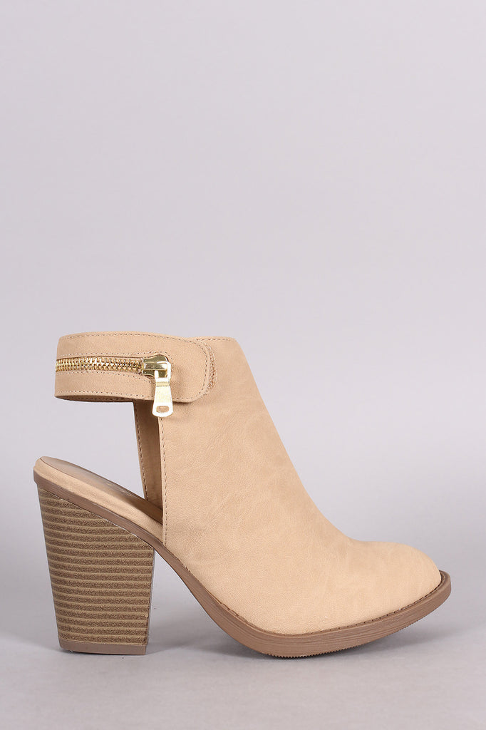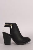 These booties feature a round toe silhouette, back cutout design, decorative zipper trim strap with hook & loop closure, chunky stacked heel, and lightly padded insole for comfort.