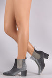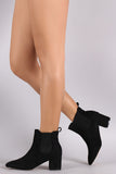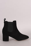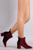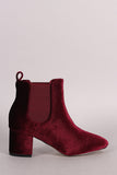 These ankle boots features a soft velvet or vegan suede upper with partial elastic gore insert, square toe silhouette, pull on tab, and covered block heel. Finished with cushioned insole and easy pull-on construction.