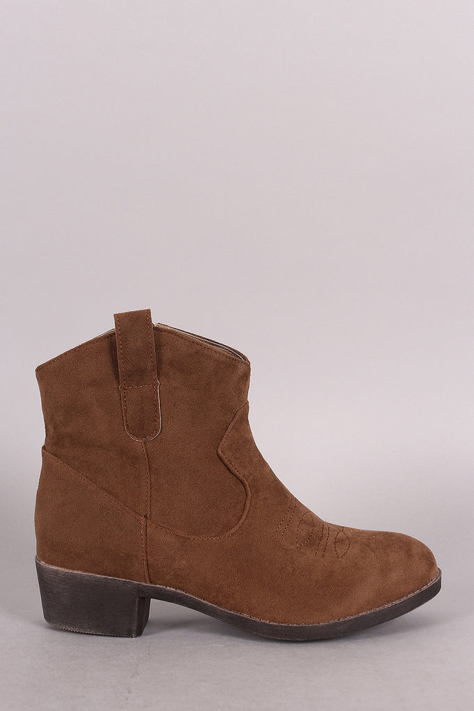 These western cowgirl ankle boots feature a round toe silhoutte, front stitch decorative pattern, side pull-on tab, and low stacked heel. Finished with cushioned insole and easy side on/off zipper closure.