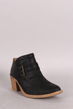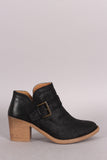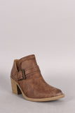 These cowgirl ankle boots feature a vegan suede upper with a distressed finish, top stitching decor, almond toe, side slit detail, and instep strap with buckles accent. Finished with a chunky stacked heel and cushioned insole for comfort.