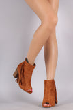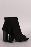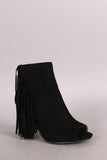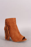 These booties features a peep toe, a side fringe detail, and chunky stacked heel. Cushioned insole and side zipper closure for easy on and off.