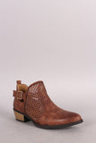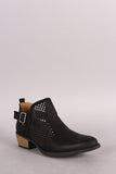 These edgy booties feature a distressed vegan suede upper with perforated detail, almond toe silhouette, side cutout design, and buckled strap accents at side. Finished with a low stacked heel and cushioned insole for comfort.