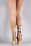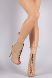 These stylish booties feature a peep toe silhouette, lace up front, back cutout design with corset detail, low hidden platform, and wrapped stiletto heel. Finished with cushioned insole and side zipper closure for easy on/off.