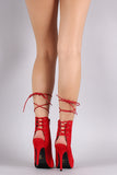 These stylish booties feature a peep toe silhouette, lace up front, cutout design with corset detail at the back, low hidden platform, and wrapped stiletto heel. Finished with cushioned insole and side zipper closure for easy on/off.