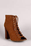 These fashion-forward booties feature a soft vegan suede upper, corset style lace-up design, peep toe silhouette, and chunky faux wooden heel. Finished with cushioned insole and convenient back-zip closure.