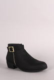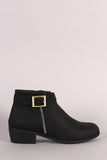 These simply chic booties feature a vegan leather upper, almond toe silhouette, buckle and strap, faux side zipper detail and low stacked heel. Zipper for easy on/off.