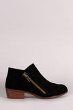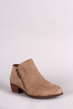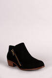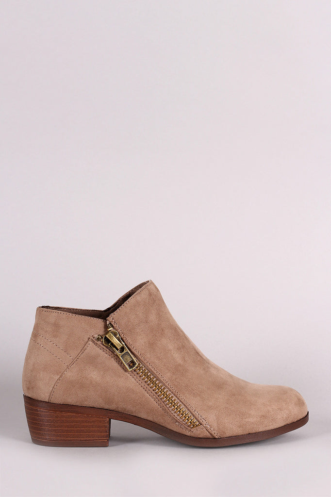 These simply chic booties feature a vegan suede upper, almond toe silhouette, side zipper detail and low stacked heel.
