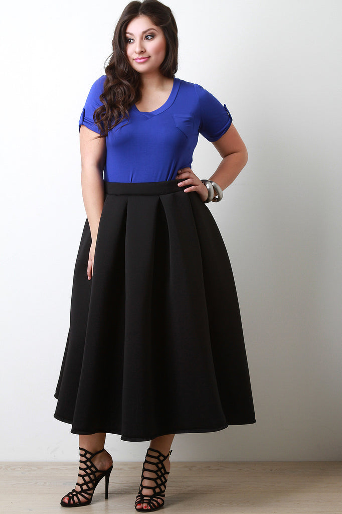 This scuba knit skirt features a wide elasticized waist, box pleating, and an A-line cut. Accessories sold separately. Made in U.S.A. 92% Polyester, 8% Spandex.