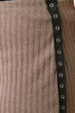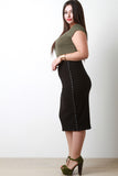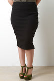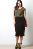 This plus size midi skirt features a vertical ribbed knit fabrication, contrasting ribbon side with snap button closure, and an elasticized waist. Accessories sold separately. Made in U.S.A. 65% Polyester, 35% Rayon.