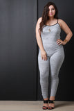 This fitted plus size jumpsuit features a soft marled knit fabrication, scoop neck with contrast spaghetti shoulder straps, sleeveless construction, and taper cut legs. Accessories sold separately. Made in U.S.A. 95% Polyester, 5% Spandex.