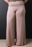 These plus size pants feature a wide leg cut, soft knit fabrication and finished with a fold over waist band. Accessories sold separately. 95% Rayon 5% Spandex.