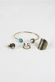 This set features a nonadjustable torc bracelet with crescent and faux stone ends, wide sigil ring, geometric ring, and two bar ring.