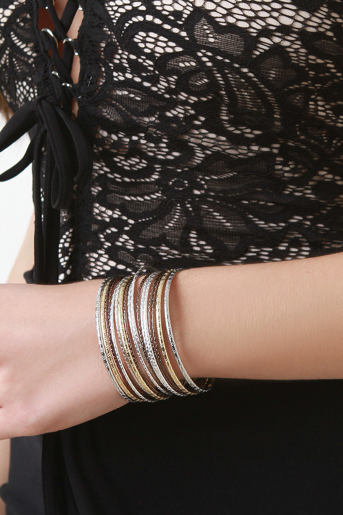 An open-ended bangle featuring stacked textured metallic wire bands.