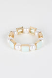 This cute bracelet features faux pearls, colored squares set in a gold toned setting and easy slip on elastic construction.