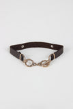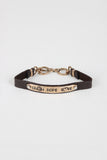 This vegan leather bracelet features a plate studded on to the bracelet and a toggle closure that adjusts to two sizes.