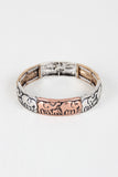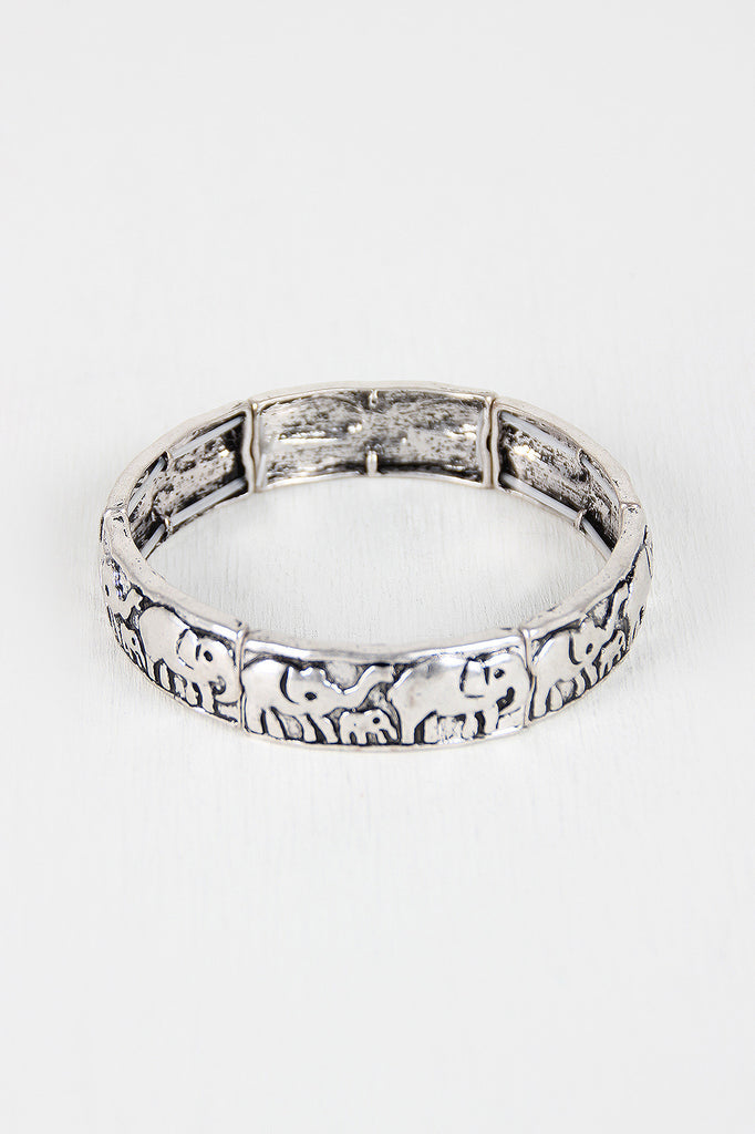 This bracelet features elephant designs etched onto metal rectangle beads and easy slip on elastic construction.