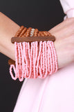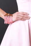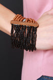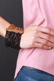 This cute bracelet features multiple strands of faux wood round beads, mini beads, one strand of clear gem beads, faux wood panels, and stretchy design for easy on/off.