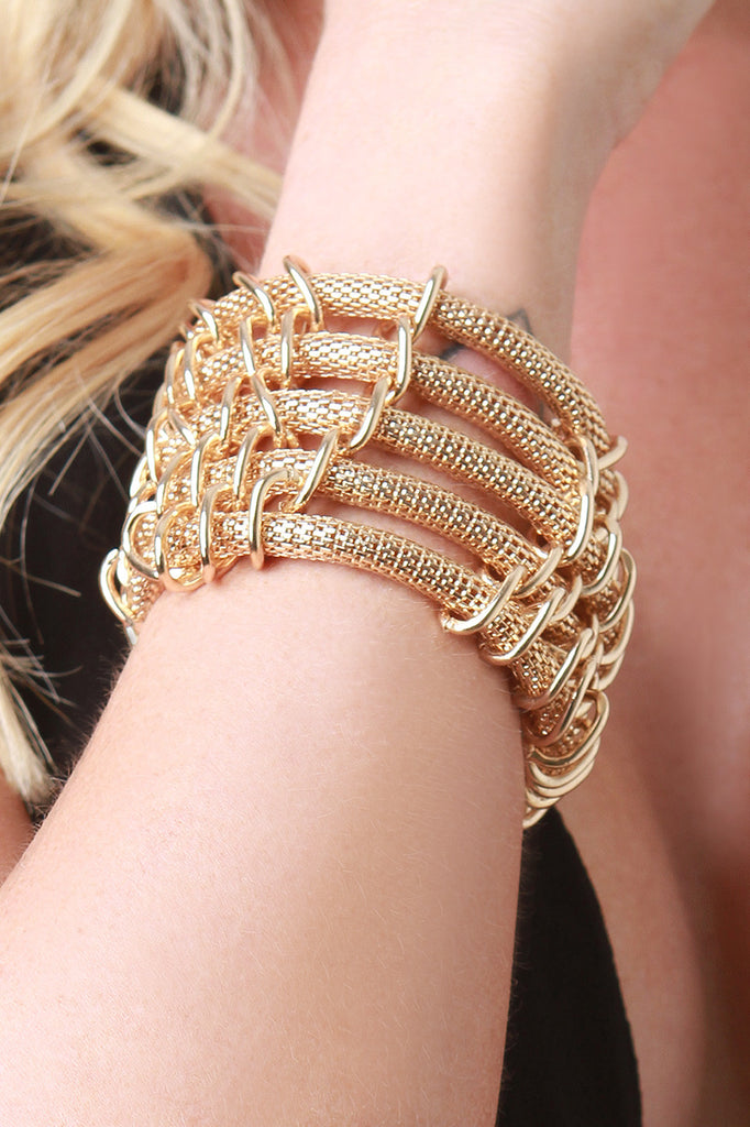 This edgy bracelet features stretchy tube chains wrapped in linked metallic rings.